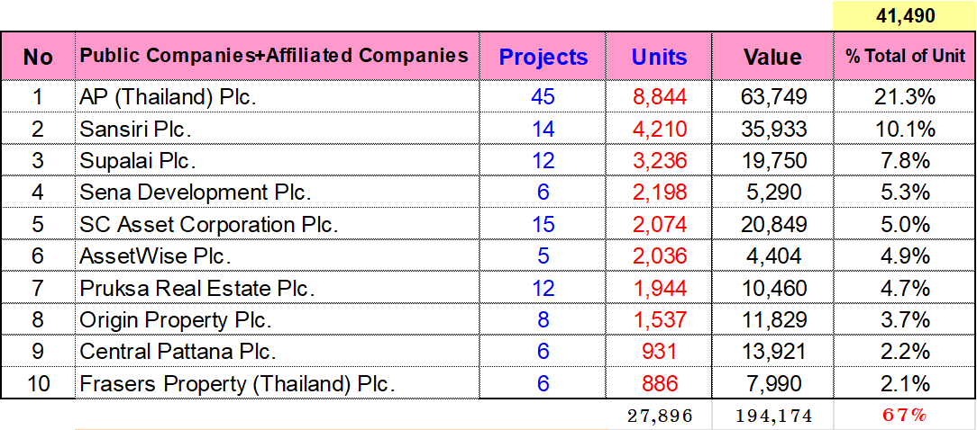 The second largest number of units developed is by Sansiri Public Company Limited, with 14 projects totaling 4,210 units, valued at 35,933 million baht, averaging 8.535 million baht per unit, giving it a 10.1% market share. Third is Supalai Public Company Limited, with 12 projects totaling 3,236 units, valued at 19,750 million baht, or an average of 6.103 million baht per unit, representing a 7.8% market share.