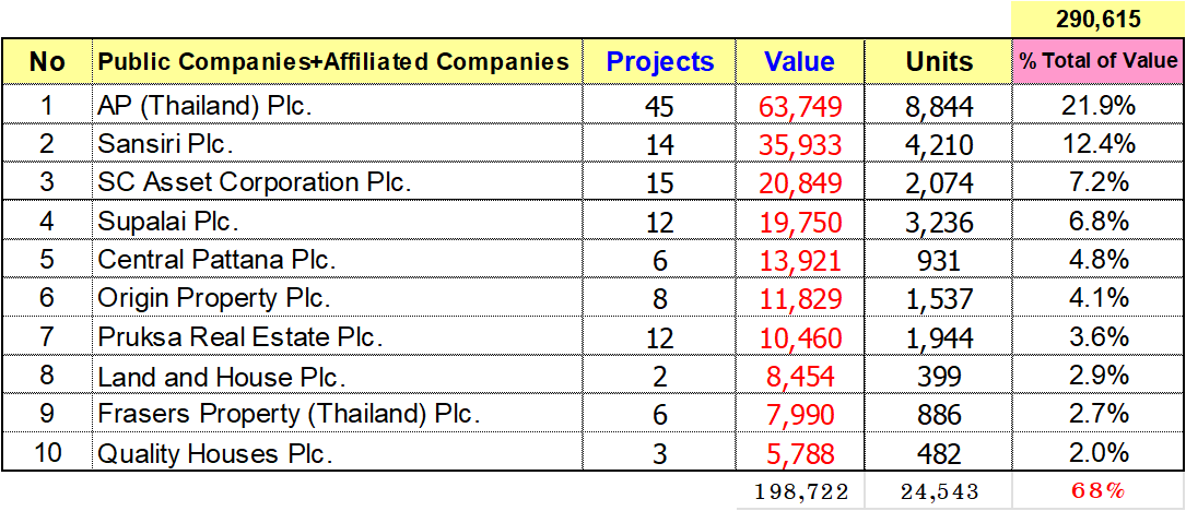 Considering development value, AP (Thailand) Public Company Limited remains in first place, followed by Sansiri Public Company Limited in second. Third place goes to SC Asset Corporation Public Company Limited, with a development value of 20,849 million baht, significantly higher than Supalai Public Company Limited's 19,750 million baht. It's worth noting that these top 10 companies account for 80% of the market share, or 198,722 million baht out of 290,615 million baht.