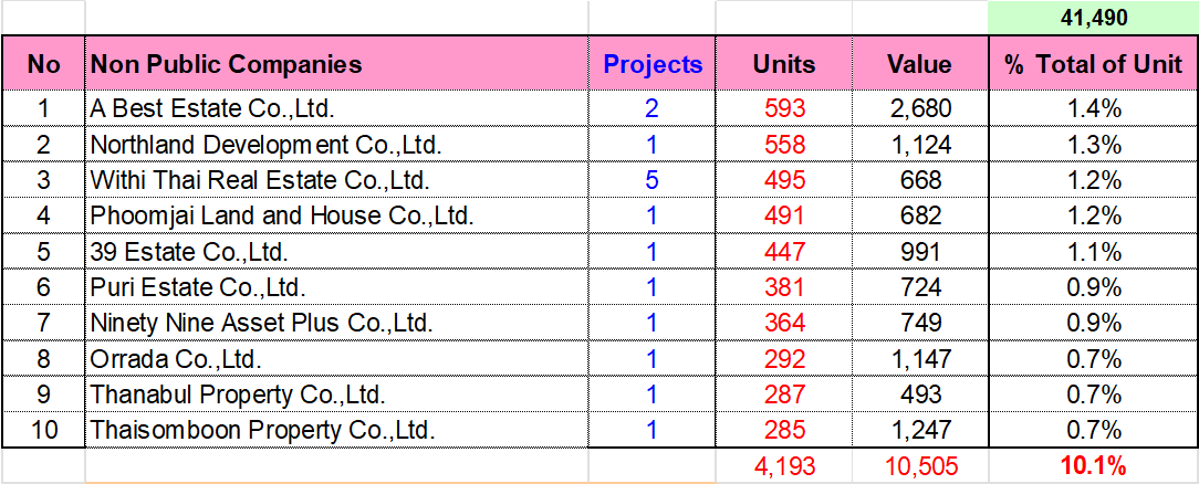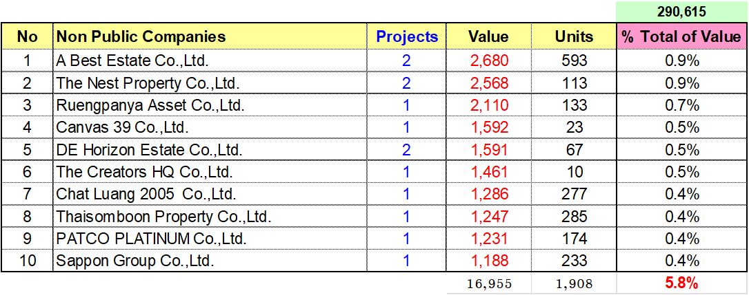 Considering the largest unlisted companies, A Best Estate Co., Ltd. developed two projects totaling 2,680 million baht and 593 units. Second is Northland Development Co., Ltd. with 558 units, and third is Vithithai Real Estate Co., Ltd. with five projects and 495 units. In terms of value, The Nest Property Co., Ltd. is second with 2,568 million baht, and third is Ruangpanya Asset Co., Ltd. with 2,110 million baht.