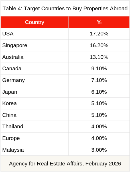 Amazingly, USA was at the top in the priority for Vietnameses at 17.2% The second was Singapore (16.2%). However, in reality, buying properties in Singapore needs 60% of stamp duty (buying tax). Australia was the third. However, foreigners were not be facilitated to buy because there were some curbs on foreign home ownership now. Next were Canada, Germany, Japan, Korea, China, ThailandChina, South Korea, Thailand and United Kingdom.