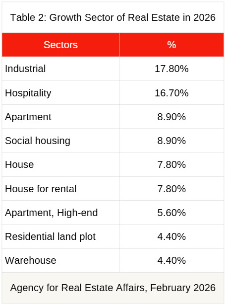 Industrial properties seemed to be the first in the priority (17.8%). Hospitality were 16.7% as the second in the priority followed by hospitality (16.7%) and owner-occupied apartments (condominiums) in general 8.9% as well as social housing also 8.9%. Other major sectors were house, house for rental, apartment high-end, residential land plot and warehouses.