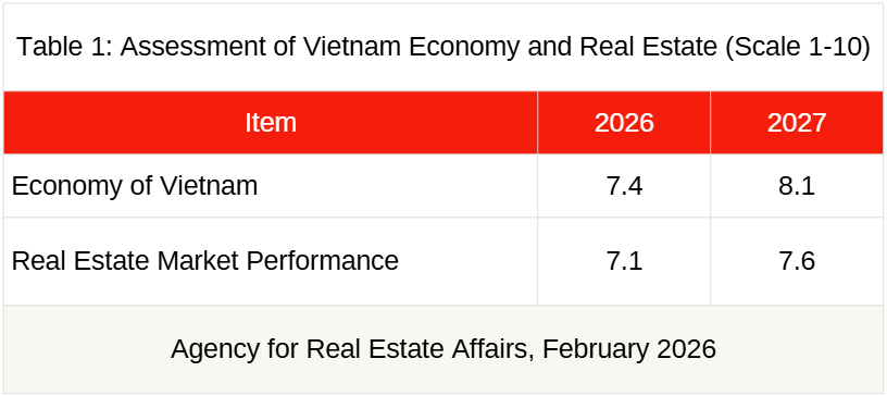 Experts in Vietnam viewed that the country’s economy in 2026 as quite moderate (assessed at 7.4 out of 10). The economy in 2027 was rated better at 8.1 which would be a lot better. Therefore, the future economy of Vietnam was at a high hope. Likewise, real estate markets were assessed to be quite moderate at 7.1 out of 10 in 2026 as well. It was forecasted to be 7.6 out of 10 in 2026. Real estate markets in Vietnam is recovering in 2026.