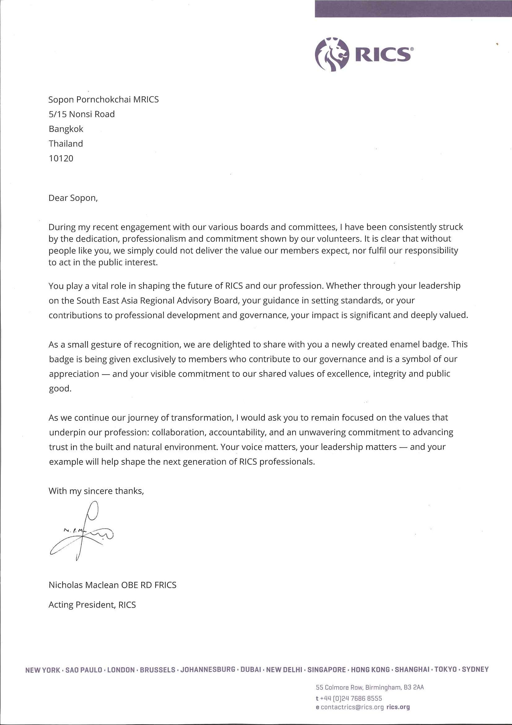 AREA Press Release No. 0077: Dr.Sopon Earning an RICS Certificate