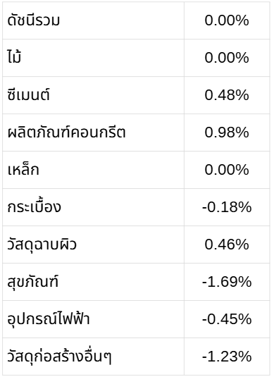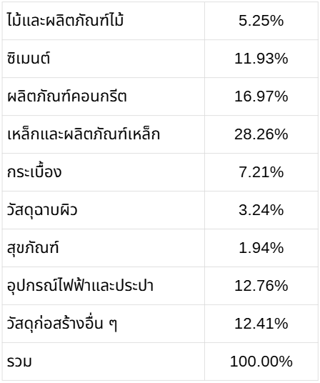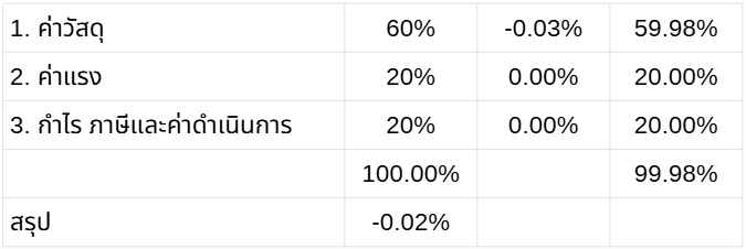 5. เมื่อวิเคราะห์ทั้งค่าวัสดุ และค่าแรงงาน กำไรภาษี ค่าดำเนินการ ทำให้ภาพรวมราคาค่าก่อสร้างอาคารปรับลดลง -0.02% ทั้งนี้เมื่อทำการนำมาปรับราคาค่าก่อสร้างอาคารแล้ว โดยรวมราคาค่าก่อสร้างไม่เปลี่ยนแปลง