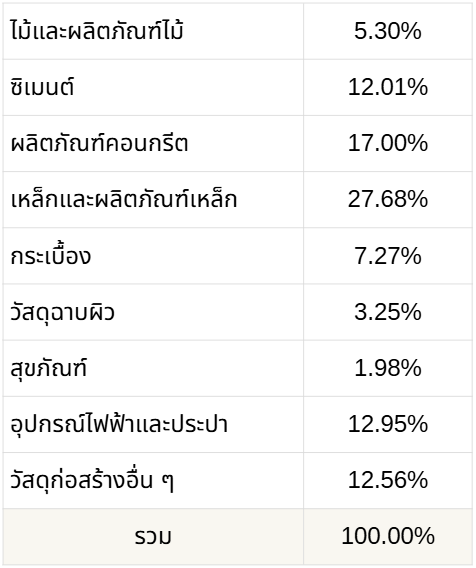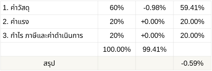 5. เมื่อวิเคราะห์ทั้งค่าวัสดุ และค่าแรงงาน กำไรภาษี ค่าดำเนินการ ทำให้ภาพรวมราคาค่าก่อสร้างอาคารปรับลดลง -0.59% ทั้งนี้เมื่อทำการนำมาปรับราคาค่าก่อสร้างอาคารแล้ว โดยรวมราคาค่าก่อสร้างปรับลดลง